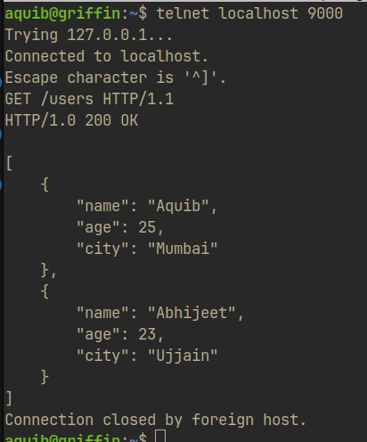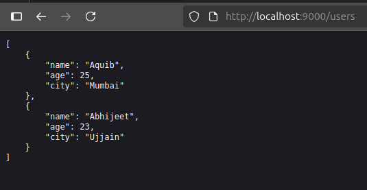 curlto send a GET request tohttp://localhost:8000/users. You should see the list of users fromusers.json.1